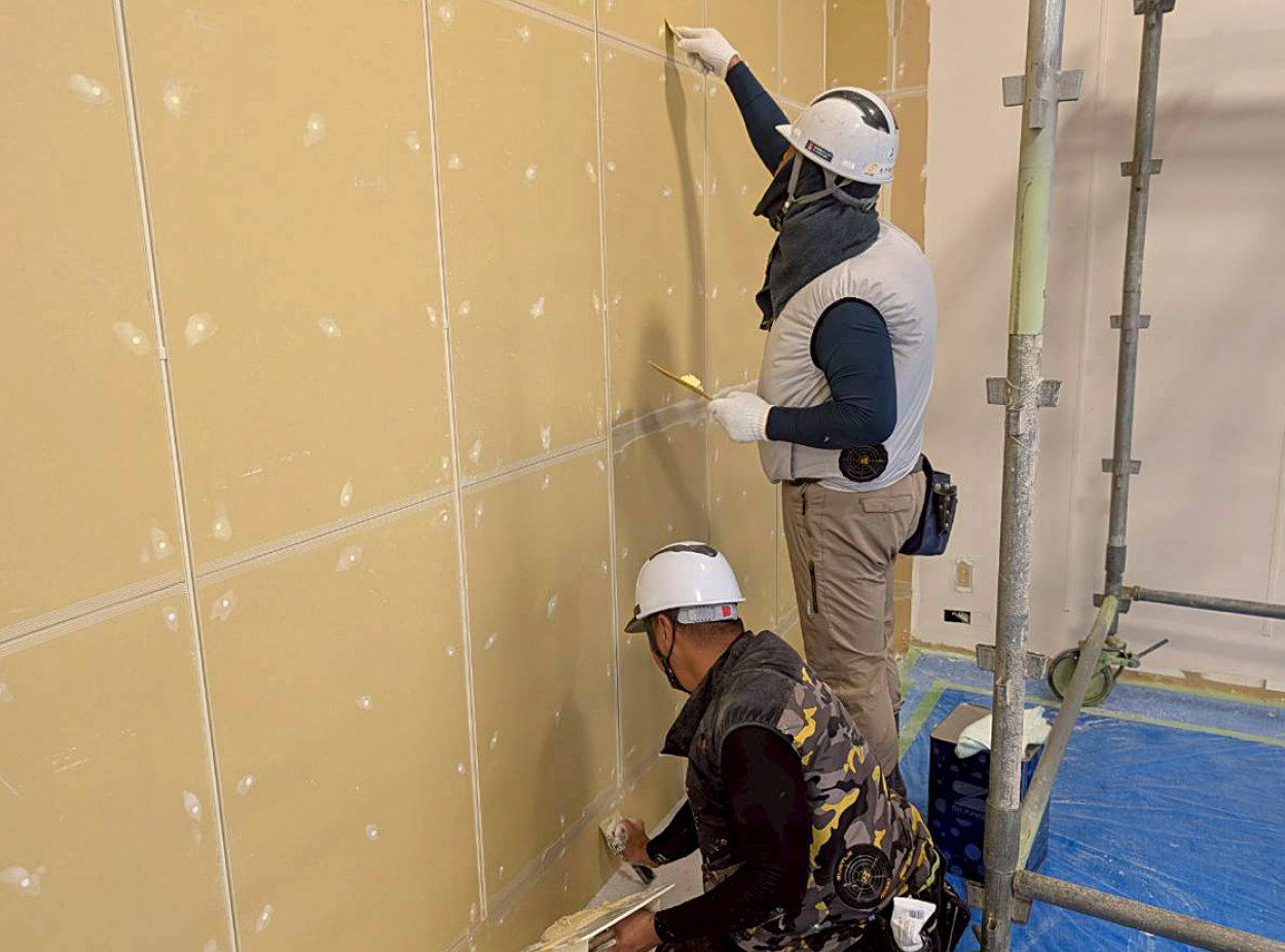 弊社ではこれまで培ってきた経験を活かした熟練の職人が作業を行っております。現場の状況に合わせた割れ止めテープの選択、割れに強いパテの選択、パテ処理後のプライマー塗装を行る事で他社より自信を持った施工を行う事で 出来ております。